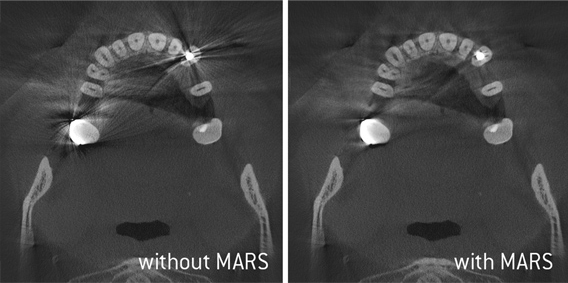 金属の修復物が入っている患者さんの場合X線画像に金属の影や不透過像(アーチファクトといいます)が生じこのせいで診断が困難になる場合があります。しかしAxeosに組み込まれたMARSソフトウェア(金属アーチファクト軽減ソフトウェア)によって、3D画像の金属アーチファクトは顕著に軽減しました。これによって画質は大きく向上し、診断が容易になります。